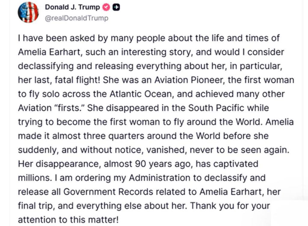 On September 26, 2025, Trump posted on Truth Social that he was going to release all remaining classified documents about the disappearance of Amelia Earhart, the female pilot who set so many records and broke so many barriers. I, personally, actually have two connections to Amelia Earhart: