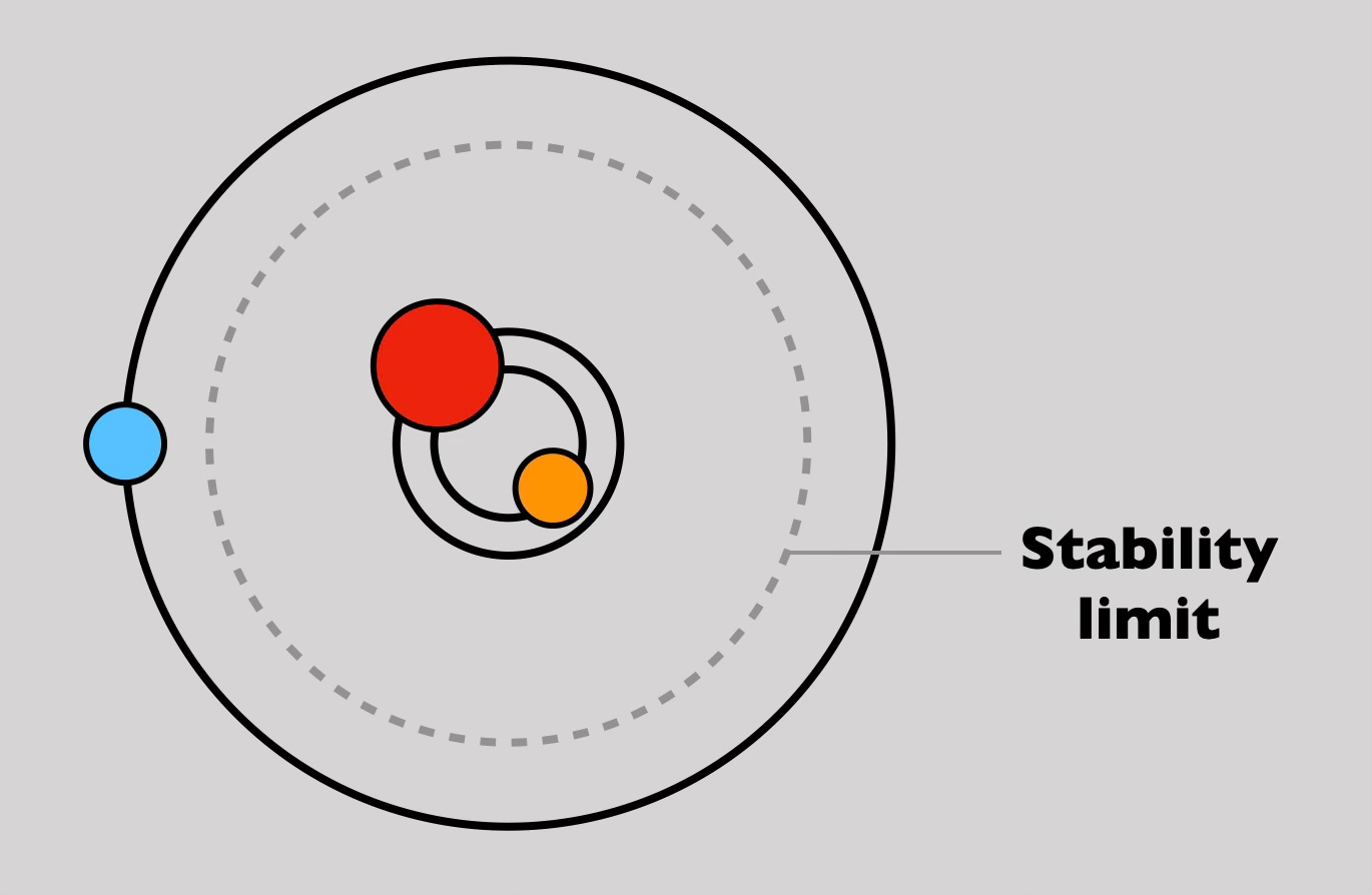 After the thesis presentation, one of the professors (whose name I did not catch) explained it to me. He’s one of the guys who determined this. It is done by modeling such a situation in the computer, thousands and thousands of such possible systems, and then running countless simulations. We can model it, we can simulate it, and we can see which starting positions of the planet fall into the gravity well and which do not. That way we can find out (approximately) where the stability limit is — We just can’t calculate it in advance.